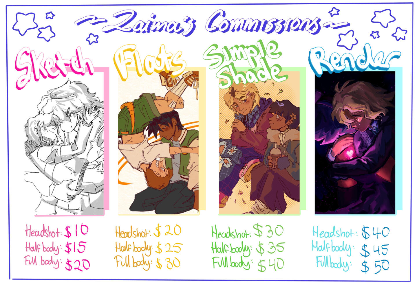 - Prices are in USD- I accept Paypal only. You will be sent invoices for all payments.- A 50% down payment must be paid before I start the commission. When the piece is complete, a watermarked version will be sent. The rest of the payment must be paid before receiving the unwatermarked version.- Progress shots will be sent throughout the process. Early changes can be made free of charge, but major changes to the piece in later stages (e.g. coloring/rendering) may constitute a fee.- Rush fees may apply. I work fairly quickly but I am still a student and I have a job outside of commissions, so please be patient!- Props may constitute a fee based on how complicated they are. Relatively simple props are free of charge.- Any extra characters have a base fee of $10, though additional charges may apply depending on how complicated their design is.- Simple backgrounds are free of charge, but more complicated backgrounds may constitute an upcharge.- Prices are not set in stone and can vary depending on the request. All details regarding the price will be discussed prior to payment!- In the case of a refund request, the down payment will not be refunded. Please make sure you are able to and willing to pay & wait for your commission.